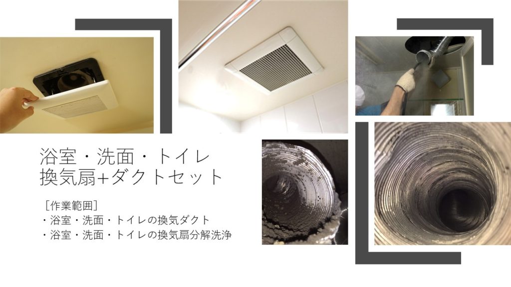 [作業範囲] ・浴室・洗面・トイレの換気ダクト ・浴室・洗面・トイレの換気扇分解洗浄
