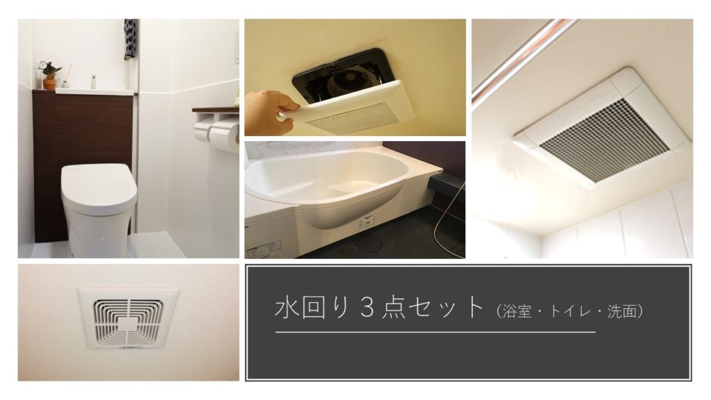 [作業範囲] バスルーム:浴槽、浴室、ヘアキャッチャー、カラン、鏡、ドア、換気口、照明カバー トイレ:便器、床、排気口、照明器具、扉 洗面:洗面台、鏡、蛇口、床、扉、収納扉、換気口、照明カバー(表面のみ)